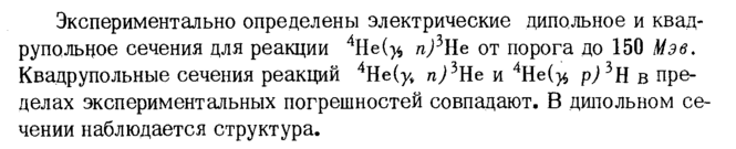 Экспериментально определены электрические дипольное и квад-рупольцое сечения для реакции 4Не(^ прЯе от порога до 150 Мэв. Квадрупольные сечения реакций 4Не(у, п)5Яе и 4Не(^ р)5Н в пределах экспериментальных погрешностей совпадают. В дипольном сечении наблюдается структура.