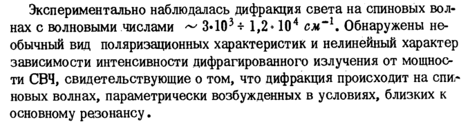 Экспериментально наблюдалась дифракция света на спиновых волнах с волновыми числами ~ 3·103 * 1,2» 104 см'1. Обнаружены необычный вед поляризационных характеристик и нелинейный характер зависимости интенсивности дифрагированного излучения от мощности СВЧ, свидетельствующие о том, что дифракция происходит на спиновых волнах, параметрически возбужденных в условиях, близких к основному резонансу.