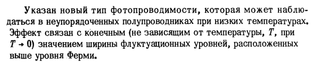 Указан новый тип фотопроводимости, которая может наблюдаться в неупорядоченных полупроводниках при низких температурах. Эффект связан с конечным (не зависящим от температуры, Т, при Τ -» 0) значением ширины флуктуационных уровней, расположенных выше уровня Ферми.