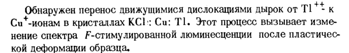 Обнаружен перенос движущимися дислокациями дырок от Т1 к Си+-ионам в кристаллах КСЬ: Си: Т1. Этот процесс вызывает изменение спектра F-стимулированной люминесценции после пластической деформации образца.