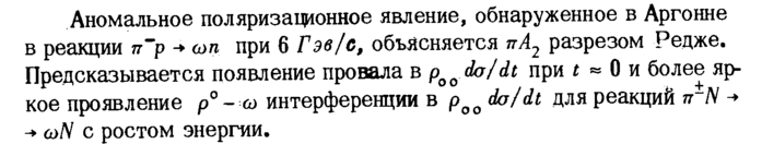 Аномальное поляризационное явление, обнаруженное в Аргонне в реакции π'р -+ ωη при 6 Гэв/с, объясняется πΑ2 разрезом Редже. Предсказывается появление провала в poQdo/dt при t « 0 и более яркое проявление р° ω интерференции в роо du/dt для реакций π~Ν -+ ω/V с ростом энергии.