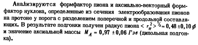 АнаЛизируются формфактор пиона и аксиально-векторный форм-фактор нуклона, определенные из сечения электрообразования пионов на протоне у порога с разделением поперечной и продольной составляющих. В результате подгонки получен радиус пиона < г^> ^ 0,48 ±0,10 $ и значение аксиальной массы МА = 0,97 ±0,06 Гэв (дипольная подгонка).