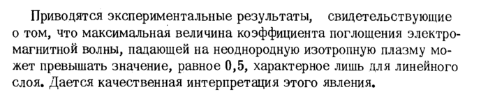 Приводятся экспериментальные результаты, свидетельствующие о том, что максимальная величина коэффициента поглощения электромагнитной волны, падающей на неоднородную изотропную плазму может превышать значение, равное 0,5, характерное лишь для линейного слоя. Дается качественная интерпретация этого явления.