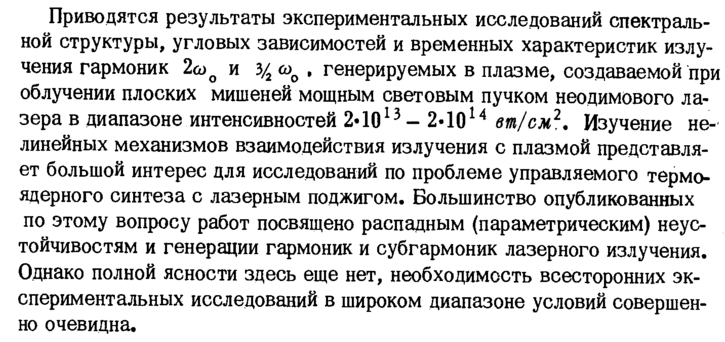 Приводятся результаты экспериментальных исследований спектральной структуры, угловых зависимостей и временных характеристик излучения гармоник 2ωο и % ωο , генерируемых в плазме, создаваемой при облучении плоских мишеней мощным световым пучком неодимового лазера в диапазоне интенсивностей 2-1013 2-1014 вт/см2. Изучение нелинейных механизмов взаимодействия излучения с плазмой представляет большой интерес для исследований по проблеме управляемого термоядерного синтеза с лазерным поджигом. Большинство опубликованных по этому вопросу работ посвящено распадным (параметрическим) неуо тойчивостям и генерации гармоник и субгармоник лазерного излучения. Однако полной ясности здесь еще нет, необходимость всесторонних экспериментальных исследований в широком диапазоне условий совершенно очевидна.
