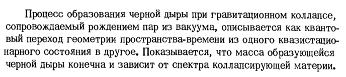 Процесс образования черной дыры при гравитационном коллапсе, сопровождаемый рождением пар из вакуума, описывается как квантовый переход геометрии пространства-времени из одного квазистационарного состояния в другое. Показывается, что масса образующейся черной дыры конечна и зависит от спектра коллапсирующей материи.