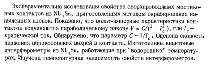 Экспериментально исследованы свойства сверхпроводящих мостико-вых контактов из Nb 3Sn, приготовленных методом скрабирования напыленных пленок. Показано, что вольт-амперные характеристики контактов подчиняются параболическому закону V = C(I2 I2 ), где 1с-критический ток. Обнаружено, что параметр С~1//с. Оценена скорость движения абрикосовских вихрей в контакте. Изготовлены квантовые интерферометры из Nb?Sn, работающие при "водородных" температурах. Изучена температурная зависимость свойств интерферометров.
