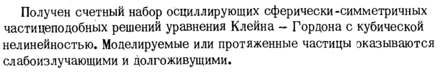 Получен счетный набор осциллирующих сферически-симметричных частицеподобных решений уравнения Клейна Гордона с кубической нелинейностью. Моделируемые или протяженные частицы оказываются слабоизлучающими и долгоживущими.