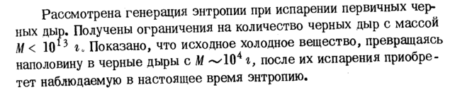 Рассмотрена генерация энтропии при испарении первичных черных дыр. Получены ограничения на количество черных дыр с массой Μ < 1013 г. Показано, что исходное холодное вещество, превращаясь наполовину в черные дыры с Μ -Л04 г, после их испарения приобретет наблюдаемую в настоящее время энтропию.