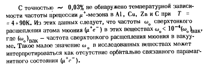С точностью 0,03% не обнаружено температурной зависимости частоты прецессии //-мезона в Al, Си, Zn и С при Τ = = 4-90К. Из этих данных следует, что частоты ωο сверхтонкого расщепления атома мюония (/zV) в этих веществах ωο< 10~4(о)Дак, где (о>о)вак частота сверхтонкого расщепления мюония в вакууме. Такое малое значение ωο в исследованных веществах может интерпретироваться как отсутствие орбйтально связанного парамагнитного СОСТОЯНИЯ (μ+ί*~)·
