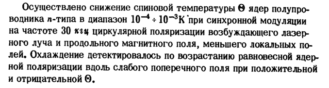 Осуществлено снижение спиновой температуры θ ядер полупроводника л-типа в диапазон 10"4* Ю^К при синхронной модуляции на частоте 30 кгц циркулярной поляризации возбуждающего лазерного луча и продольного магнитного поля, меньшего локальных полей. Охлаждение детектировалось по возрастанию равновесной ядерной поляризации вдоль слабого поперечного поля при положительной и отрицательной Θ.