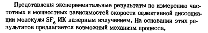 Представлены экспериментальные результаты по измерению частотных и мощностных зависимостей скорости селективной диссоциации молекулы SF6 ИК лазерным излучением. На основании этих результатов предлагается возможный механизм процесса.