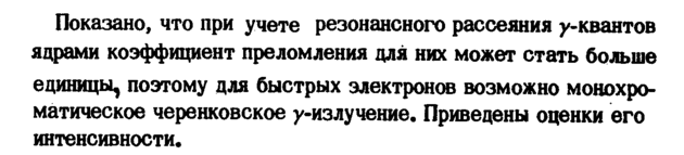 Показано, что при учете резонансного рассеяния у-квантов ядрами коэффициент преломления для них может стать больше единицы, поэтому для быстрых электронов возможно монохроматическое черенковское у-излучение. Приведены оценки его интенсивности.