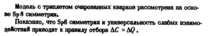 Модель с триплетом очарованных кварков рассмотрена на основе Sp В симметрии» Показано, что Sp6 симметрия и универсальность слабых взаимодействий приводят к правилу отбора АС = Д@.