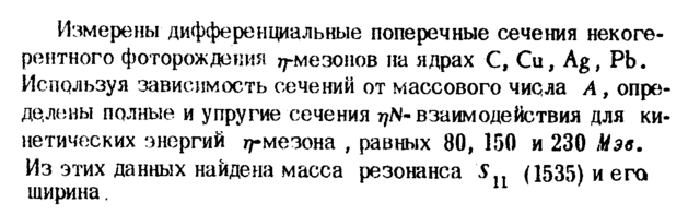 Измерены дифференциальные поперечные сечения некогерентного фоторождения тт-мезонов на ядрах С, Си, Ag, РЬ. Используя зависимость сечений от массового числа А, определимы полные и упругие сечения τ?Νвзаимодействия для кинетических энергий //-мезона , равных 80, 150 и 230 Мэв. Из этих данных найдена масса резонанса 5Ц (1535) и его ширина.