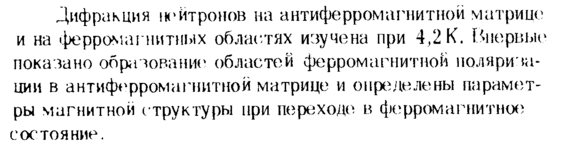 Дифракция нейтронов на антиферромагнитной матрице и на ферромагнитных областях изучена при 4,2 К. Впервые показано образование областей ферромагнитной поляризации в антиферромагнитной матрице и определены параметры магнитной структуры при переходе в ферромагнитное состояние.