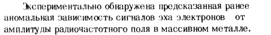 Экспериментально обнаружена предсказанная ранее аномальная зависимость сигналов эха электронов от амплитуды радиочастотного поля в массивном металле.