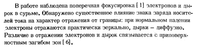 В работе наблюдена поперечная фокусировка [ 1] электронов и дырок в сурьме. Обнаружено существенное влияние знака заряда носителей тока на характер отражения от границы: при нормальном падении электроны отражаются практически зеркально, дырки диффузно. Различие в отражении электронов и дырок связывается с приповерхностным загибом зон [ 6],