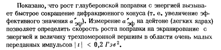 Показано, :что рост глауберовской поправки с энергией вызывает быстрое сокращение дифракционного конуса (т. е. увеличение эффективного значения а ^ф). Измерение а^ф на дейтоне (легких ядрах) позволяет определить скорость роста поправки на экранирование с энергией и величину трехпомеронной вершины в области очень малых переданных импульсов 11 \ < 0,2 Гэв2.