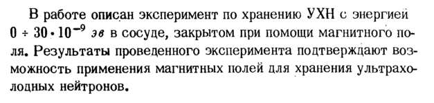 В работе описан эксперимент по хранению УХН с энергией 0 * 30· 10~9 эв в сосуде, закрытом при помощи магнитного поля. Результаты проведенного эксперимента подтверждают возможность применения магнитных полей для хранения ультрахолодных нейтронов.