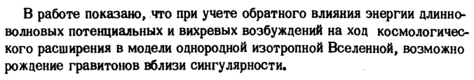 В работе показано, что при учете обратного влияния энергии длинноволновых потенциальных и вихревых возбуждений на ход космологического расширения в модели однородной изотропной Вселенной, возможно рождение гравитонов вблизи сингулярности.