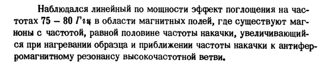 Наблюдался линейный по мощности эффект поглощения на частотах 75 — 80 Лг14 в области магнитных полей, где существуют маг-ноны с частотой, равной половине частоты накачки, увеличивающийся при нагревании образца и приближении частоты накачки к антиферромагнитному резонансу высокочастотной ветви.