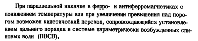 При параллельной накачке в феррои антиферромагнетиках с понижением температуры или при увеличении превышения над порогом возможен кинетический переход, сопровождающийся установлением дальнего порядка в системе параметрически возбужденных спиновых волн (ПВСВ).