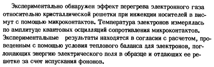 Экспериментально обнаружен эффект перегрева электронного газа относительно кристаллической решетки при инжекции носителей в висмут с помощью микроконтактов. Температура электронов измерялась по амплитуде квантовых осцилляции сопротивления микроконтактов. Экспериментальные результаты находятся в согласии с расчетом, проведенным с помощью условия теплового баланса для электронов, поглощающих энергию электрического поля в образце и отдающих ее решетке за счет испускания фононов.