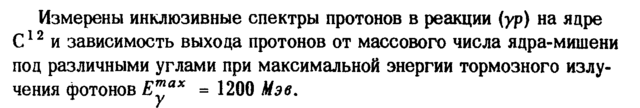 Измерены инклюзивные спектры протонов в реакции (ур) на ядре С12 и зависимость выхода протонов от массового числа ядра-мишени под различными углами при максимальной энергии тормозного излучения фотонов Етах = 1200 Мэв.