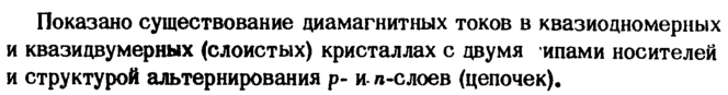Показано существование диамагнитных токов в квазиодномерных и квазицвумерных (слоистых) кристаллах с двумя ипами носителей и структурой альтернирования ри л-слоев (цепочек).