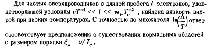 Для чистых сверхпроводников с длиной пробега I электронов, удовлетворяющей условиям υΤ~ι « I « vtpT~2 , найдена вязкость вихрей при низких температурах. С точностью цо множителя Ιη^Δj ответ соответствует предположению о существовании нормальных областей с размером порядка ξο = v/Tc.