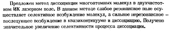 Предложен метод диссоциации многоатомных молекул в двухчастот-ном ИК лазерном поле. В данном методе слабое резонансное поле осуществляет селективное возбуждение молекул, а сильное иерезонансное -последующее возбуждение в квазиконтинууме и диссоциацию. Получено значительное увеличение селективности процесса диссоциации.