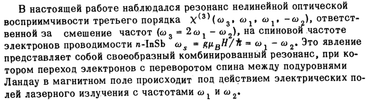 В настоящей работе наблюдался резонанс нелинейной оптической восприимчивости третьего порядка Χ(3)(ω3, ω1» ωχ9 -ω2), ответственной за смешение частот (ω3 = 2ω1 ω2), на спиновой частоте электронов проводимости n-InSb cos = #μβ///Λ = ω, ω2· Это явление представляет собой своеобразный комбинированный резонанс, при котором переход электронов с переворотом спина между подуровнями Ландау в магнитном поле происходит под действием электрических полей лазерного излучения с частотами ωχ и ω2.