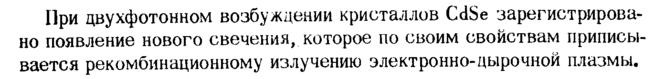 При двухфотонном возбуждении кристаллов CdSe зарегистрировано появление нового свечения, которое по своим свойствам приписывается рекомбинационному излучению электронно-дырочной плазмы.