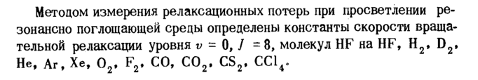 Методом измерения релаксационных потерь при просветлении резонансно поглощающей среды определены константы скорости вращательной релаксации уровня ν = 0, / =8, молекул HF на HF, Н2» D2< Не, Ar, Хе, 02, F2. СО, С02. CS2, СС14*