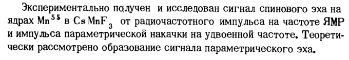 Экспериментально пцлучен и исследован сигнал спинового эха на ядрах Мп55 в CsMnF3 от радиочастотного импульса на частоте ЯМР и импульса параметрической накачки на удвоенной частоте. Теоретически рассмотрено образование сигнала параметрического эха.