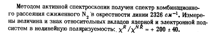 Методом активной спектроскопии получен спектр комбинационного рассеяния сжиженного N2 в окрестности линии 2326 ем"1. Измерены величина и знак относительных вкладов ядерной и электронной подсистем в нелинейную поляризуемость:, xR /χ « + 200 ± 40,