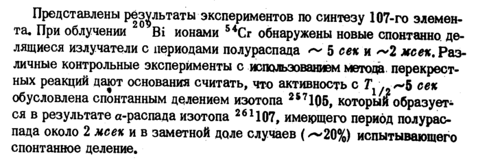 Представлены результаты экспериментов по синтезу 107-го элемента. При облучении Bi ионами 54Сг обнаружены новые спонтанно, делящиеся излучатели с периодами полураспада -~ 5 сек и ~2 мсек. Различные контрольные эксперименты с использованием метода перекрестных реакций дают основания считать, что активность с Т^^Ь сек обусловлена спонтанным делением изотопа 2S71Q5, который образуете ся в результате α-распада изотопа 261107, имеющего период полураспада около 2 мсек и в заметной доле случаев (<~20%) испытывающего спонтанное деление.
