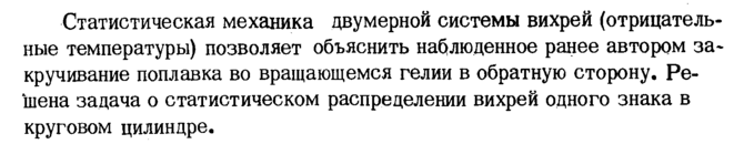 Статистическая механика двумерной системы вихрей (отрицательные температуры) позволяет объяснить наблюденное ранее автором закручивание поплавка во вращающемся гелии в обратную сторону. Решена задача о статистическом распределении вихрей одного знака в круговом цилиндре.