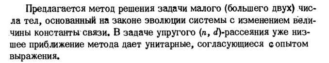Предлагается метод решения задачи малого (большего двух) чис ла тел, основанный на законе эволюции системы с изменением вели чины константы связи. В задаче упругого (п, </)-рассеяния уже низшее приближение метода дает унитарные, согласующиеся с опытом выражения.