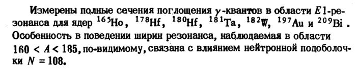 Измерены полные сечения поглощения у-квантов в области Ε1 -резонанса для ядер 165Но, l78Hf, l80Hf, l81Ta, 182W, l97Au и 209Bi . Особенность в поведении ширин резонанса, наблюдаемая в области 160 < А< 185, по-видимому, связана с влиянием нейтронной подоболач-ки N = 108.