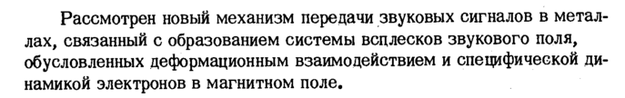 Рассмотрен новый механизм передачи звуковых сигналов в металлах, связанный с образованием системы всцлесков звукового поля, обусловленных деформационным взаимодействием и специфической динамикой электронов в магнитном поле.