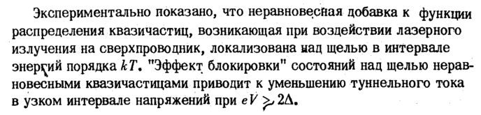 Экспериментально показано, что неравновесная добавка к функции распределения квазичастиц, возникающая при воздействии лазерного излучения на сверхпроводник, локализована над щелью в интервале энергий порядка к Г. "Эффект блокировки" состояний над щелью неравновесными квазичастицами приводит к уменьшению туннельного тока в узком интервале напряжений при еУ ^2Δ·