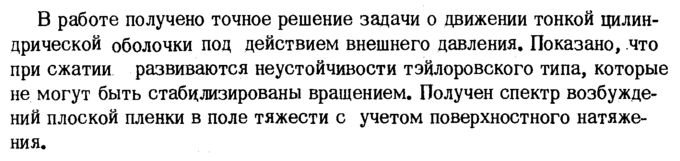 В работе получено точное решение задачи о движении тонкой цилиндрической оболочки под действием внешнего давления. Показано, .что при сжатии развиваются неустойчивости тэйлоровского типа, которые не могут быть стабилизированы вращением. Получен спектр возбуждений плоской пленки в поле тяжести с учетом поверхностного натяжения.