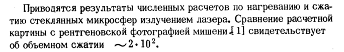 Приводятся результаты численных расчетов по нагреванию и сжатию стеклянных микросфер излучением лазера. Сравнение расчетной картины с рентгеновской фотографией мишени Л] свидетельствует об объемном сжатии *—' 2 * 10 2·