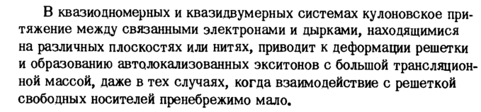 В квазиодномерных и квазидвумерных системах кулоновское притяжение между связанными электронами и дырками, находящимися на различных плоскостях или нитях, приводит к деформации решетки и образованию автолокализованных экситонов с большой трансляционной массой, даже в тех случаях, когда взаимодействие с решеткой свободных носителей пренебрежимо мало.