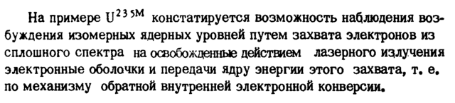На примере и235М констатируется возможность наблюдения возбуждения изомерных ядерных уровней путем захвата электронов из сплошного спектра на огаобожденные действием лазерного излучения электронные оболочки и передачи ядру энергии этого захвата, т. е. по механизму обратной внутренней электронной конверсии.