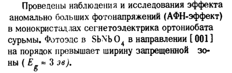 Проведены наблюдения и исследования эффекта аномально больших фотонапряжений (АФН-эффект) в монокристаллах сегнетоэлектрика ортониобата сурьмы. Фотоэдс в SbNb04 в направлении [001] на порядок превышает ширину запрещенной зоны ( Ε « 3 эв)9