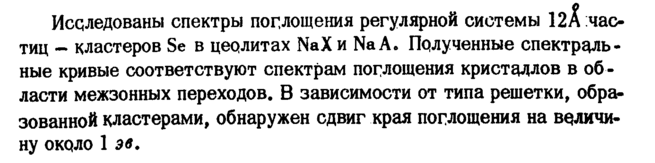 Исследованы спектры поглощения регулярной системы 12А частиц кластеров Se в цеолитах NaX и Na А. Полученные спектргрнь-ные кривые соответствуют спектрам поглощения кристадлов в об ласти межзонных переходов. В зависимости от типа решетки, обра^ зованной кластерами, обнаружен сдвиг края поглощения на величину около 1 эв.