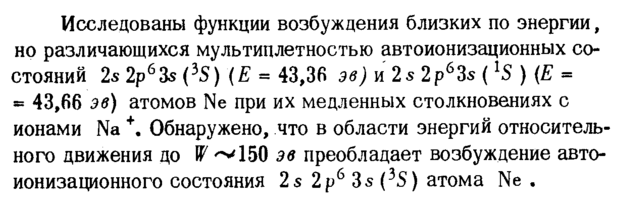 Исследованы функции возбуждения близких по энергии, но различающихся мультицлетностью автоионизационных состояний 2s 2p63s (3S) (Ε = 43,36 эв) и 2s 2P63s (lS ) (Ε = « 43,66 эв) атомов Ne при их медленных столкновениях с ионами Na +. Обнаружено, что в области энергий относительного движения до W ^150 эв преобладает возбуждение автоионизационного состояния 2 s 2ρ6 3s (3S) атома Ne .