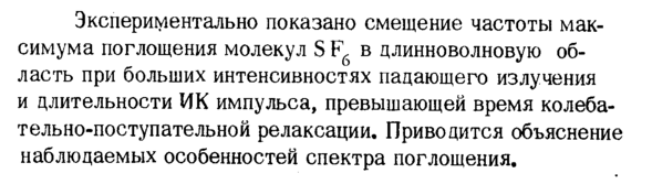 Экспериментально показано смещение частоты максимума поглощения молекул SF6 в длинноволновую область при больших интенсивностях падающего излучения и длительности ИК импульса, превышающей время колебательно-поступательной релаксации. Приводится объяснение наблюдаемых особенностей спектра поглощения.